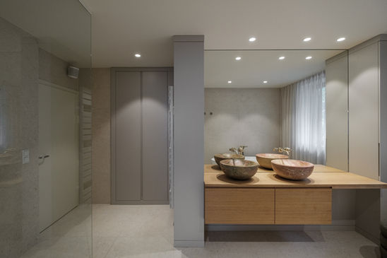 Im Inneren wurden Räume geöffnet und Raumstrukturen dadurch grundlegend verändert. Konstruktiv mussten Stahlträger und neue Überlager hergestellt werden, um dieses neue, offene Wohnen zu ermöglichen. Im Obergeschoß wurden kleine Räume ebenso neu aufgeteilt, um zeitgemäße Schlafräume mit angrenzendem Schrankraum zu schaffen. Das Elternbad wurde ebenso bis auf die Rohdecke abgebrochen und an derzeitige technische Standards angepasst. Eine freistehende Badewanne sowie die bodenebene Dusche sorgen für den modernen Charakter dieses Raumes. Waschbecken, die Bar in der Küche sowie Beistelltische aus Stein, welche alle samt aus der hauseigenen Produktion der Bauherren stammen, bilden die Designelemente dieser Innenräume.
